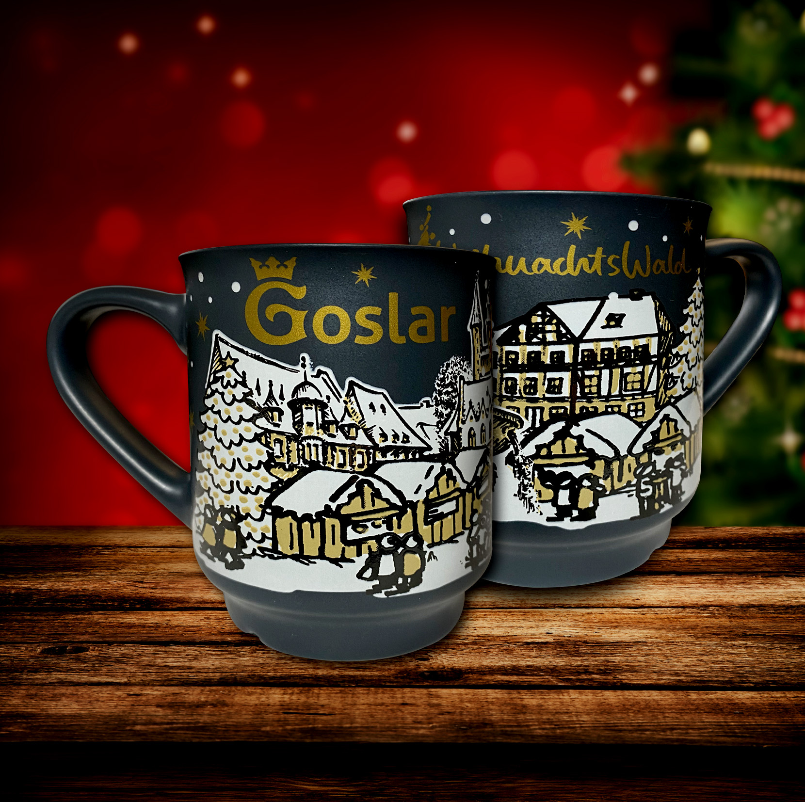 Der anthrazitfarbene Becher mit Weihnachtsmarktmotiv ist ein schönes Andenken an Ihren Besuch auf dem Weihnachtsmarkt und im Weihnachtswald Goslar. Der Keramikbecher ist spülmaschinengeeignet und hat Platz für 0,2 Liter Glühwein, Tee oder was immer Sie am liebsten an kalten Winterabenden trinken.